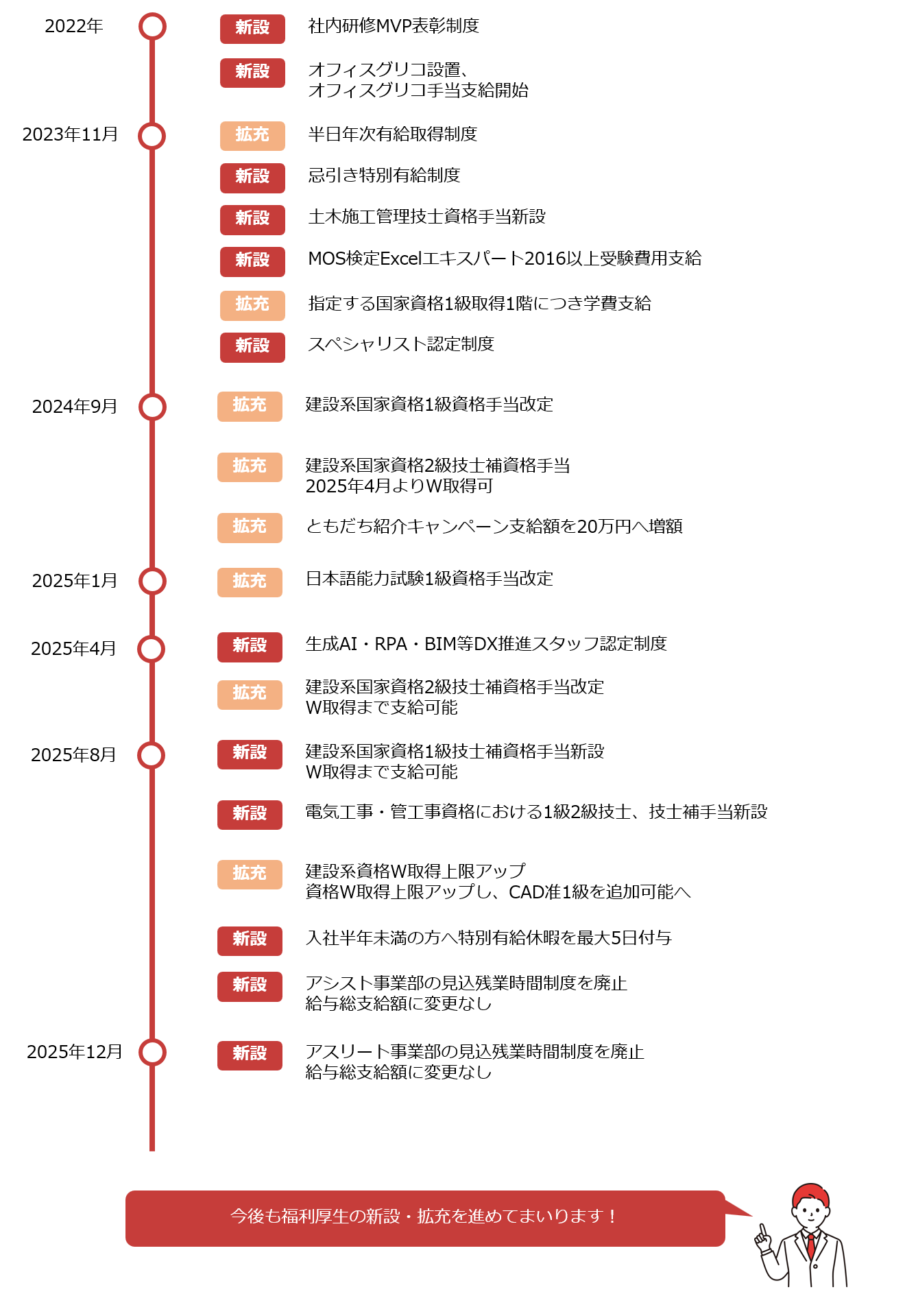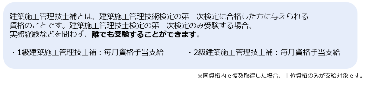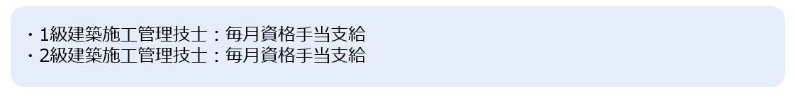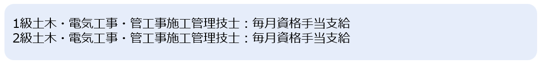・従来の建築施工管理技士1級・2級に加えて、土木施工管理技士1級・2級、電気工事施工管理技士1級・2級、管工事施工管理技士1級・2級も手当対象に
