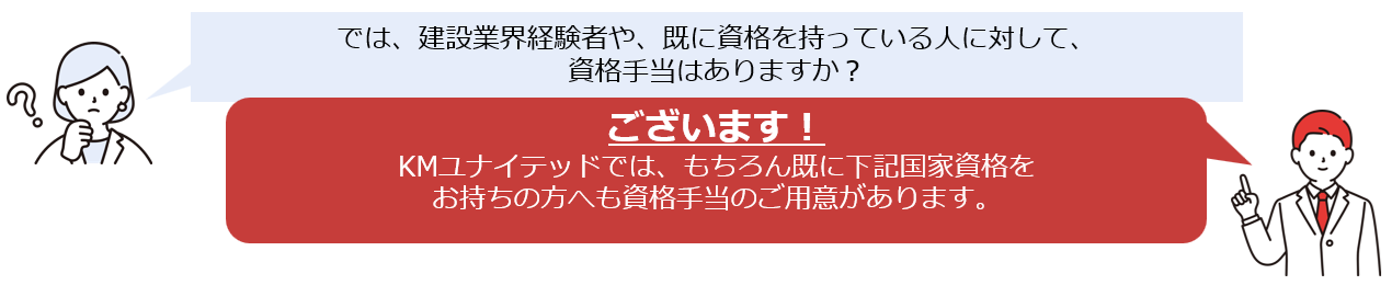 当社では、以下の国家資格を取得されると、毎月資格手当を支給いたします。